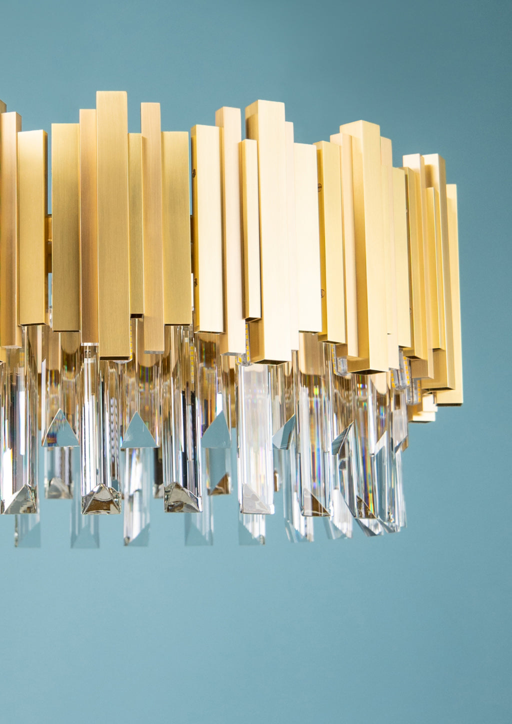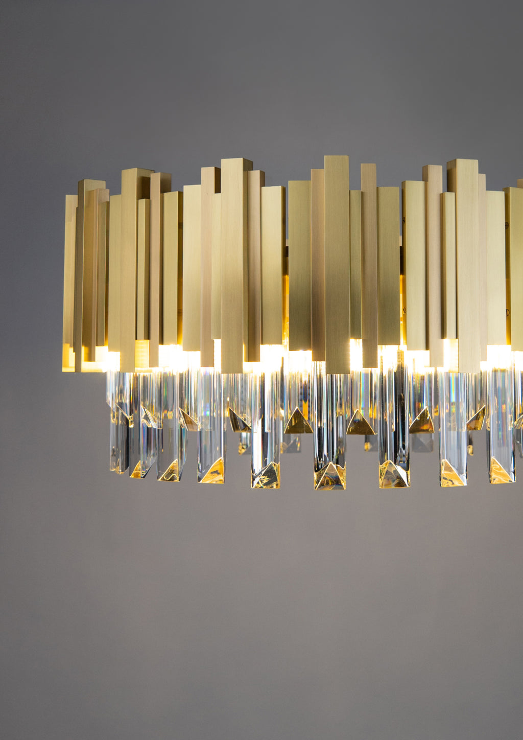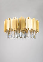 Petros, Art Deco style Chandelier, Satin Brass, Gently brushed and lacquered brass, Clear Zip by Scholer Crystal Austria (various high quality materials), Adjustable Height, D615xH300mm, 18xG9. Regular collection model.
