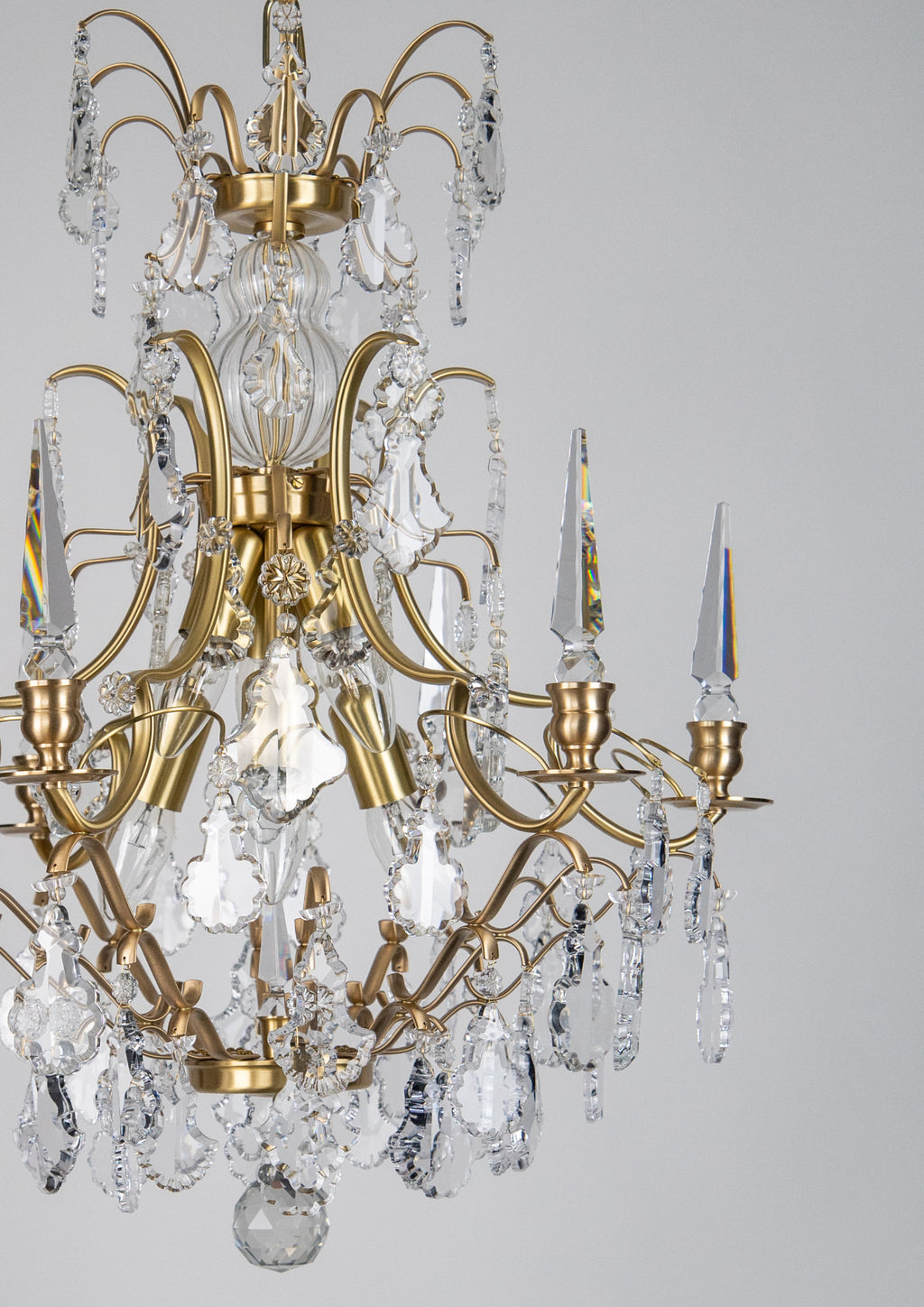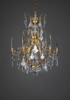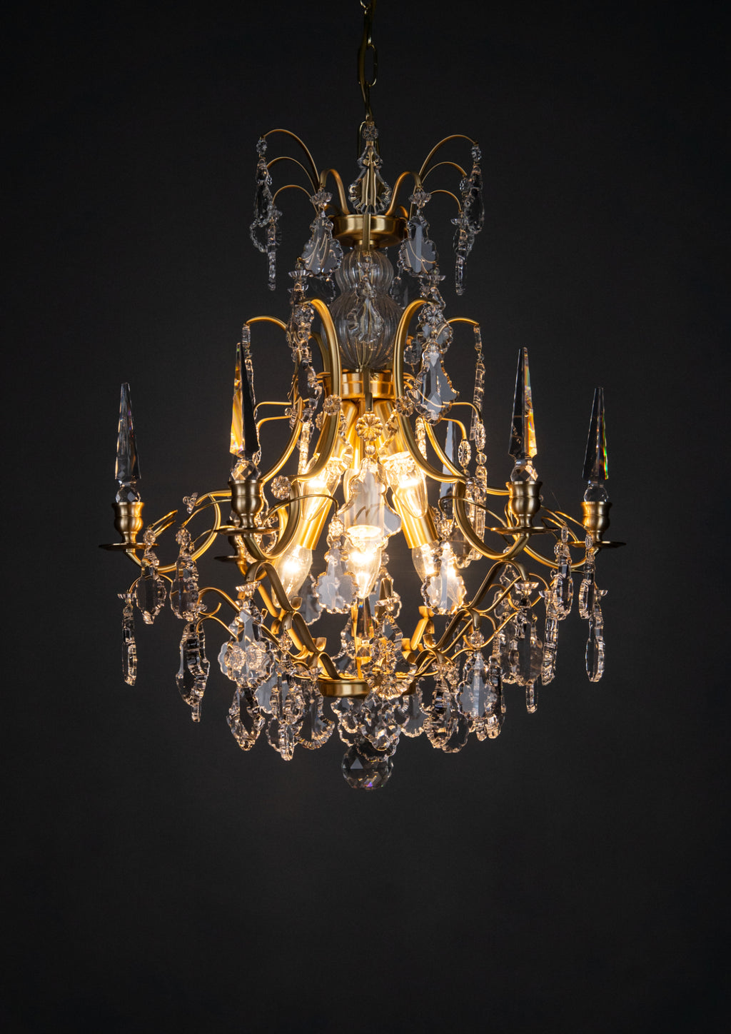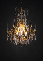 Pompe, Baroque style Chandelier, Cognac, Light oxidised and lacquered brass, Clear Basic by Scholer Crystal Austria (hand cut crystal), D540xH610mm, 11kg, 6xE14. Regular collection model.